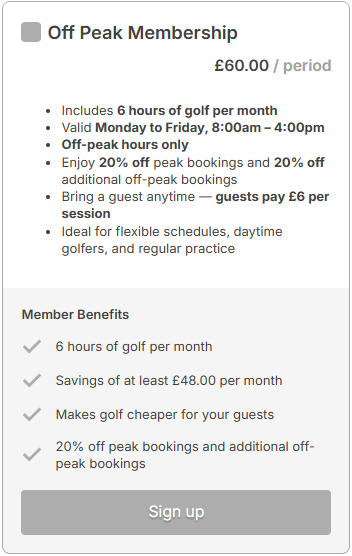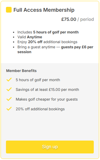 For £75 per month, members receive 5 free hours of golf per calendar month. Guests pay the standard rate of £6 per hour which works out cheaper for them too.